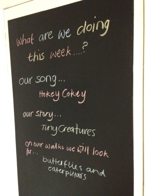 So, this is what we have been up to. Our new playroom blackboard is great. The ideas for the week ahead go on the top and the children (and me) have fun drawing and scribbling on the bottom.